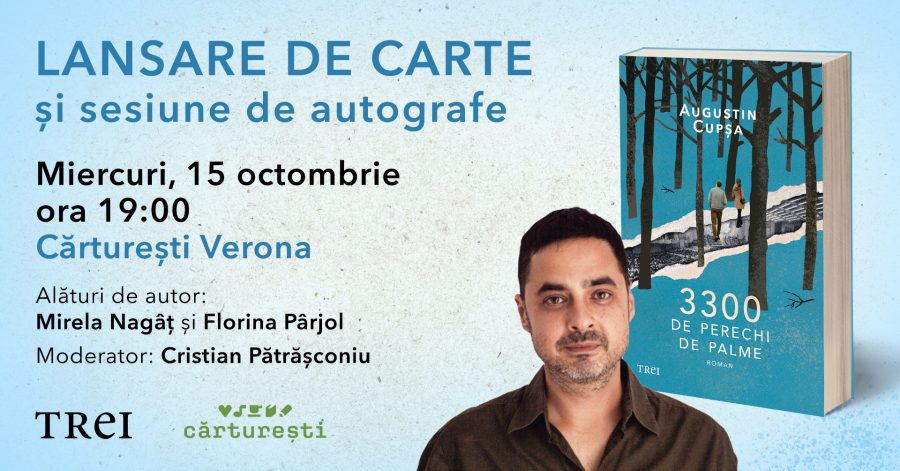 Editura Trei și Librăria Cărturești Verona (str. Pictor Arhur Verona nr. 13-14) vă invită miercuri, 15 octombrie, la evenimentul de lansare al celui mai recent roman scris de Augustin Cupșa – „3300 de perechi de palme”. Alături de autor vor vorbi Mirela Nagâț și Florina Pârjol. Moderator – Cristian Pătrășconiu. Seara se va încheia cu […]
