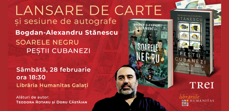 Editura Trei și Librăria Humanitas Galati (Strada Domnească nr.45) vă invită sâmbătă, 28 februarie, ora 18:30, la întâlnirea cu Bogdan-Alexandru Stănescu și ultimele două volume apărute la editura Trei – romanul „Soarele negru” și volumul de eseuri „Peștii cubanezi”. Alături de autor participă Doru Căstăian și Teodora Rotaru. Seara se va încheia cu o sesiune […]