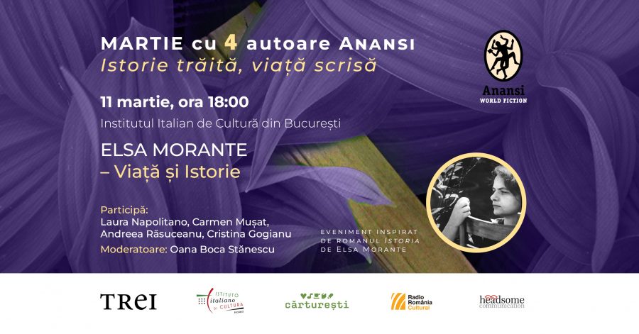 Editura Trei, imprintul Anansi.World Fiction și Institutul Francez din România la București vă invită miercuri, 11 martie, începând cu ora 18:00, la cel de-al doilea eveniment din seria „Istorie trăită, viață scrisă”, inspirat de literatura Elsei Morante. Participă Laura Napolitano – directorul Institutului Italian de Cultură din București, Carmen Mușat – profesor universitar, critic literar, Andreea Răsuceanu […]