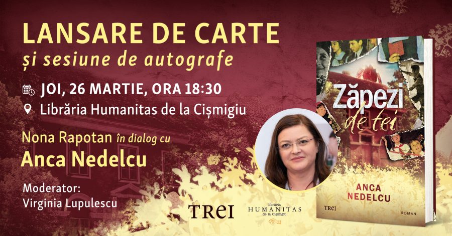Editura Trei și Librăria Humanitas de la Cișmigiu (Bd.Regina Elisabeta nr.38) vă invită joi, 26 martie, începând cu ora 18:30, la evenimentul de lansare a cărții „Zăpezi de tei”, romanul de debut scris de Anca Nedelcu. Autoarea va intra în dialog cu Nona Rapotan, profesor și jurnalist. Discuția va fi moderată de Virginia Lupulescu, editor. […]