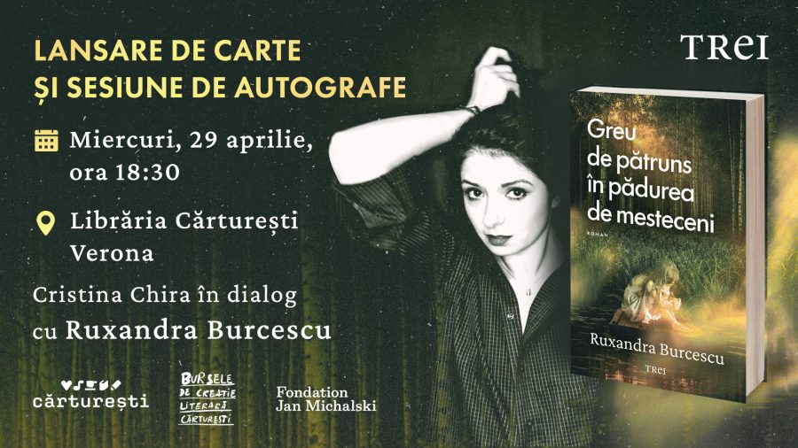 Editura Trei și Librăria Cărturești Verona (str.Pictor Arthur Verona nr.15) vă invită miercuri, 29 aprilie, ora 18:30, la evenimentul de lansare a cărții „Greu de pătruns în pădurea de mesteceni” de Ruxandra Burcescu. Autoarea va intra în dialog cu Cristina Chira. Seara se va încheia cu o sesiune de autografe. „Pădurea mirosea a pământ răscolit […]