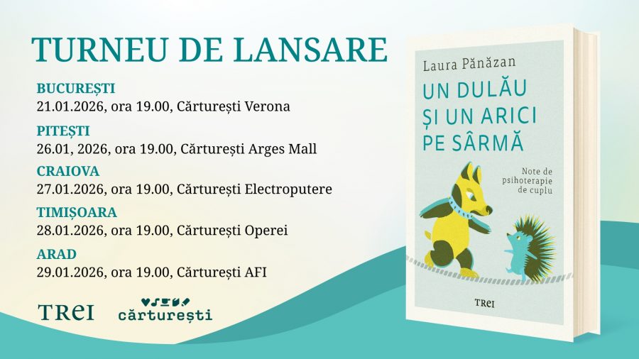 Laura Pănăzan, autoarea cărții „Un dulău și un arici pe sârmă.Note de psihoterapie de cuplu” apărută la Editura Trei, își întâlnește cititorii din București, Pitești, Craiova, Timișoara și Arad între 21 – 29 ianuarie 2026, în cadrul unui amplu turneu care va continua în prima jumătate a anului viitor. Vom reveni cu detalii în ce […]