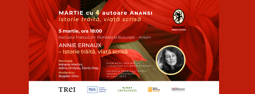 Editura Trei, imprintul Anansi.World Fiction și Institutul Francez din România la București vă invită joi, 5 martie, începând cu ora 18:00, la primul eveniment din seria Istorie trăită, viață scrisă, inspirat de literatura lui Annie Ernaux. Participă: Mélanie Martini, Adina Dinițoiu, Deniz Otay Moderator: Bogdan Ghiu Evenimentul va avea loc în sala Atrium a Institutului Francez (Bulevardul […]