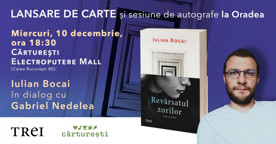 Editura Trei, Revista Familia și Cărturești Craiova vă invită miercuri, 10 decembrie, ora 18:30, la evenimentul de lansare a volumului de proză scurtă „Revărsatul zorilor”, recent apărut la editura Trei. Autorul va intra în dialog cu Gabriel Nedelea. Seara se va încheia cu o sesiune de autografe. „E mereu la fel în relațiile lungi: întâi […]