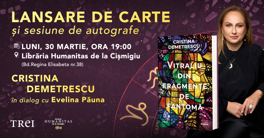 Editura Trei și Librăria Humanitas de la Cișmigiu (Bd.Regina Elisabeta nr.38) vă invită vineri, 30 martie, la evenimentul de lansare a romanului de debut scris de Cristina Demetrescu, „Vitraliu din fragmente de fantomă”, recent apărut la editura Trei. Autoarea va intra în dialog cu Evelina Păuna, jurnalist. Seara se va încheia cu o sesiune de […]