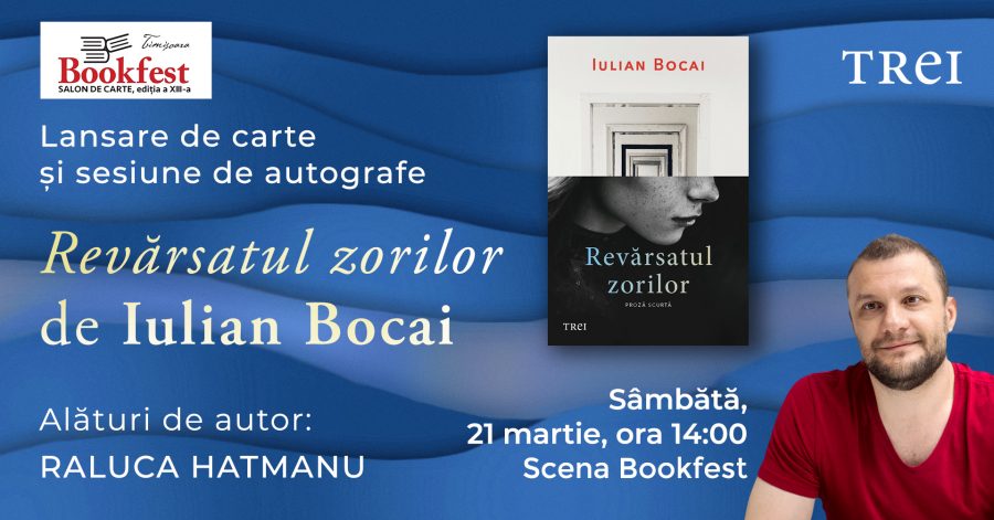 Editura Trei și Bookfest Timișoara vă invită sâmbătă, 21 martie, ora 14:00, la Scena Bookfest la evenimentul de lansare a cărții „Revărsatul zorilor”, de Iulian Bocai. Autorul va intra în dialog cu Raluca Hatmanu, jurnalist. „Ceea ce mă fascinează la Bocai sunt naratorii lui straniu de inocenți și de asexuați, spectatori dezîncarnați ai vieții lor, […]