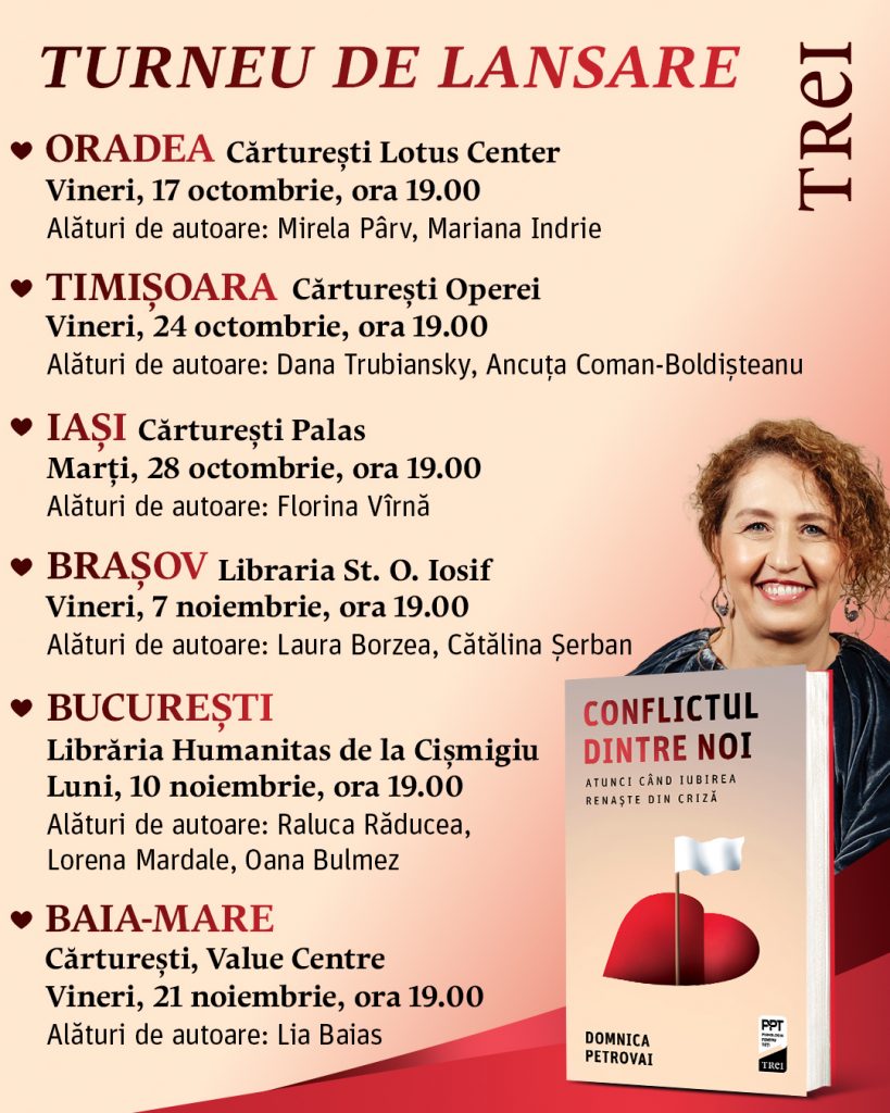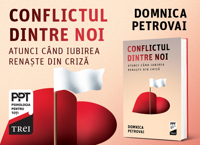 „De prea multe ori am văzut cât de mult dor conflictele din cuplu. Apar pe neașteptate, provoacă rupturi și, cel mai grav, ne fac să credem că nu mai există altă cale când realitatea este alta. Firește, fac parte din orice relație, doar că nimeni nu ne-a învățat cum să le traversăm sănătos, cu mai multă blândețe și înțelegere față de celălalt. Așa că, de multe ori, alegem atacul, retragerea sau învinovățirea. Și, totuși, există altă cale!”, care poate fi descoperită în cartea Conflictul dintre noi. Atunci când iubirea renaște din criză (link site) publicată recent de Domnica Petrovai la Editura Trei, în colecția Psihologia pentru Toți.
