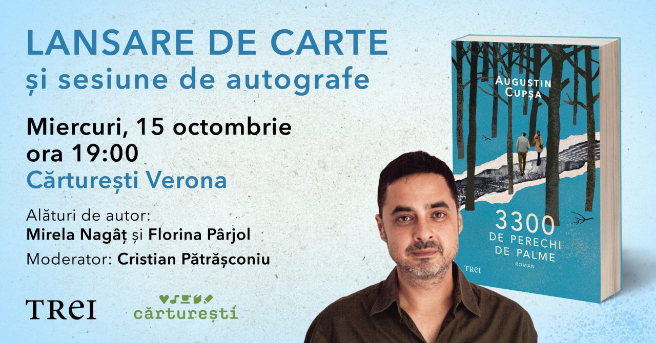 Editura Trei și Librăria Cărturești Verona (str. Pictor Arhur Verona nr. 13-14) vă invită miercuri, 15 octombrie, la evenimentul de lansare al celui mai recent roman scris de Augustin Cupșa – „3300 de perechi de palme”. Alături de autor vor vorbi Mirela Nagâț și Florina Pârjol. Moderator – Cristian Pătrășconiu. Seara se va încheia cu o sesiune de autografe.