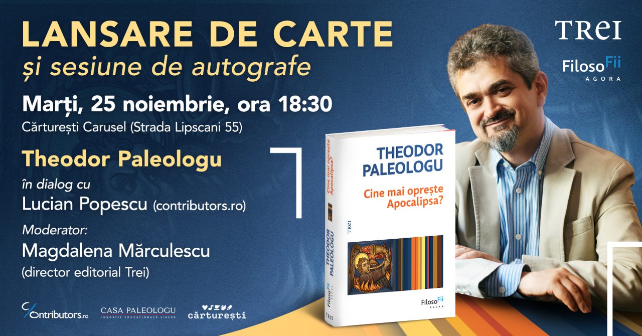 Editura Trei și Librăria Cărturești Carusel (str.Lipscani nr.55) vă invită marți, 25 noiembrie, ora 18:30, la evenimentul de lansare a cărții „Cine mai oprește Apocalipsa?” de Theodor Paleologu, aflat în curs de apariție în colecția FilosoFII, coordonată de Magdalena Mărculescu. Alături de autor vor vorbi Lucian Popescu (contributors.ro) și Magdalena Mărculescu, director editorial Trei.